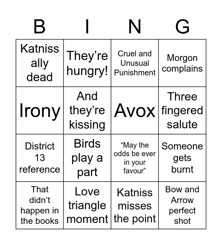 This bingo card has 19 words: “May the odds be ever in your favour”, Tribute dies, Cruel and Unusual Punishment, Bow and Arrow perfect shot, Someone gets burnt, Irony, Katniss misses the point, Katniss ally dead, They’re hungry!, District 13 reference, Birds play a part, And they’re kissing, Avox, Love triangle moment, That didn’t happen in the books, Molly complains ., Morgon complains, Three fingered salute and Cool futurism.
