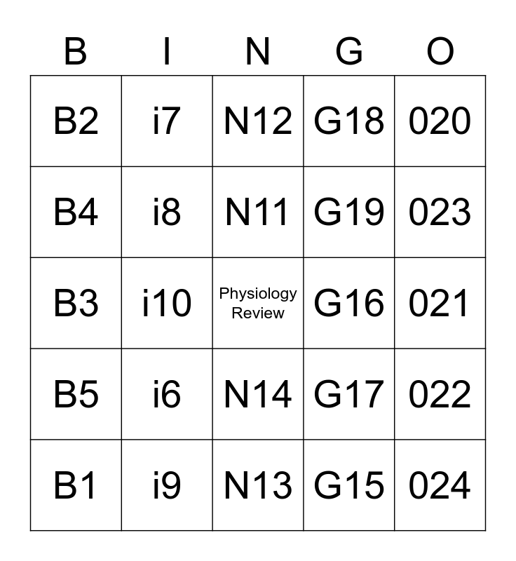 This bingo card has a free space and 24 words: B1, i6, N11, G15, 020, B2, i7, N12, G16, 021, B3, i8, G17, 022, B4, i9, N13, G18, 023, B5, i10, N14, G19 and 024.