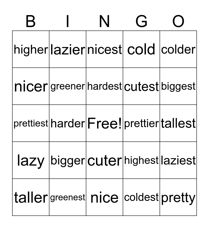 This bingo card has a free space and 24 words: bigger, greenest, hardest, taller, colder, higher, nicer, lazier, prettier, cuter, cutest, prettiest, highest, laziest, greener, coldest, tallest, nicest, biggest, harder, pretty, lazy, cold and nice.