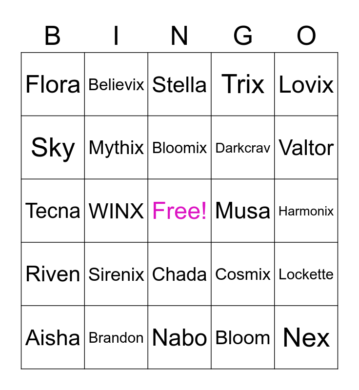 This bingo card has a free space and 24 words: Aisha, Sirenix, Bloomix, Bloom, Lovix, Flora, Believix, Stella, Musa, Harmonix, Tecna, Mythix, Cosmix, Lockette, Sky, Brandon, Nabo, Trix, Valtor, Riven, WINX, Chada, Darkcrav and Nex.