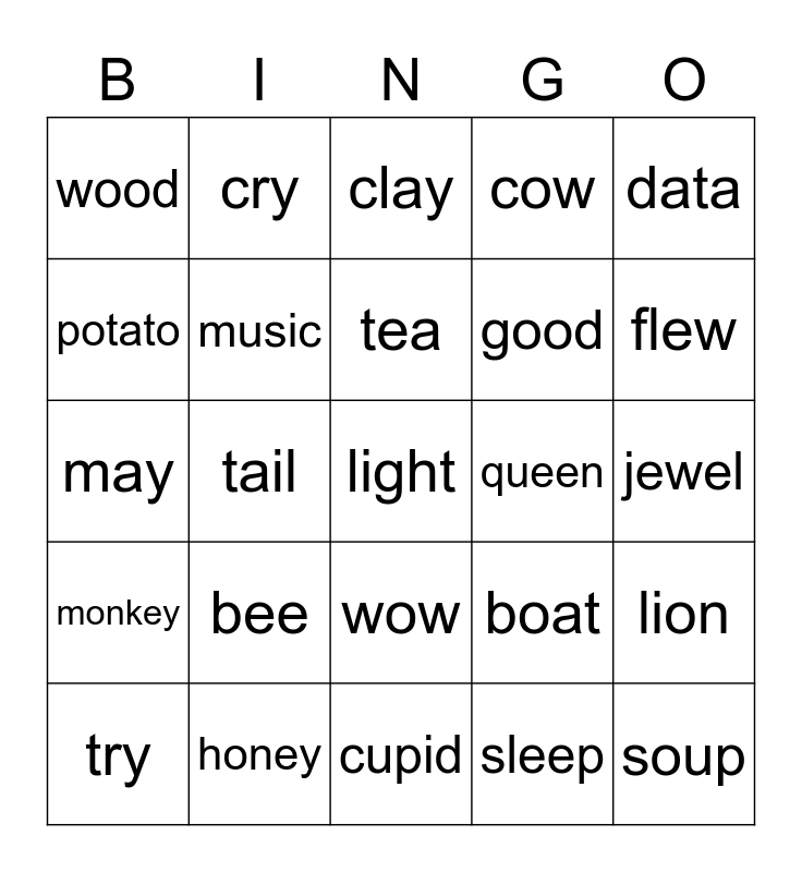 This bingo card has a free space and 24 words: bee, honey, tea, try, data, wood, potato, cry, queen, wow, good, may, boat, lion, music, sleep, jewel, clay, flew, tail, soup, monkey, cow and cupid.