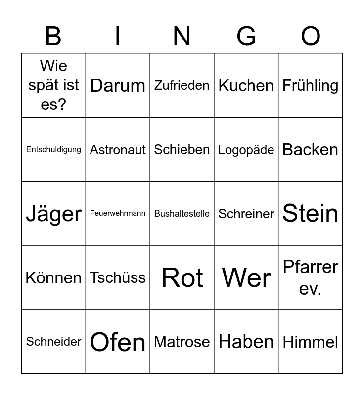 This bingo card has 105 words: Mutter, Kind, Frühling, Sommer, Herbst, Winter, Blumen, Klee, Trauben, Schnee, Morgen, Tag, Abend, Nacht, Wie Geht´s, Mir geht´s gut, Zufrieden, Müde, Glücklich, Gesund, Krank, Durstig, Hungrig, Fröhlich, Nicht, Tschüss, Backen, Kuchen, Bäcker, Rufen, Wer, Haben, Sieben, Eier, Schmalz, Salz, Milch, Mehl, Schieben, Ofen, Schön, Können, Helfen, Entschuldigung, Keine Ahnung, Wie spät ist es?, Gehen, Bushaltestelle, Herzlich willkommen, Himmel, Blau, Schenken, Sonne, Licht, Baum, Grün, Meer, Welt, Blume, Rot, Stein, Grau, Wolke, Weiß, Vogel, Lied, Kleider, Darum, Jäger, Feuerwehrmann, Matrose, Schwarz, Schornsteinfeger, Bunt, Maler, Krankenwagenfahrer, Hausfrau, Handwerker, Schneider, Lehrer, Fußpflege, Ingenieur, Koch, Astronaut, Beamter, Schreiner, Tierarzt, Verkäufer, Mechaniker, Friseur, Informatiker, Sekretärin, Bankkauffrau, Apotheker, Pfarrer ev., Pfarrer, kath., Hörgeräteakustiker, Ergotherapeut, Logopäde, Arzt, HNO-Arzt, Augenarzt, Hausarzt, Zahnarzt and Altenpfleger.