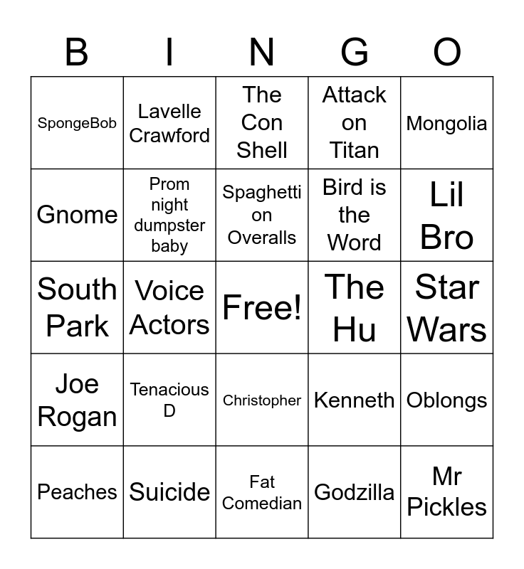 This bingo card has a free space and 30 words: Gabriel Iglesias, Suicide, The Con Shell, Blue mouse, Mongolia, SpongeBob, Prom night dumpster baby, Spaghetti on Overalls, Bird is the Word, Mr Pickles, Peaches, Tenacious D, Godzilla, Dimensions, Joe Rogan, Kangaroo Jack, Fat Comedian, The Hu, Oblongs, Gnome, Voice Actors, Power Rangers, Attack on Titan, Star Wars, South Park, Lavelle Crawford, Christopher, Kenneth, Lil Bro and clap your hands.