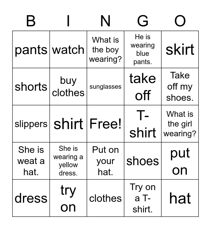 This bingo card has a free space and 24 words: She is wearing a yellow dress., try on, sunglasses, dress, skirt, pants, shorts, watch, T-shirt, Put on your hat., take off, slippers, shoes, put on, buy clothes, Try on a T-shirt., What is the girl wearing?, What is the boy wearing?, Take off my shoes., shirt, hat, She is weat a hat., He is wearing blue pants. and clothes.