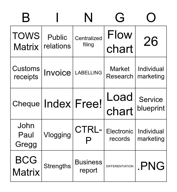 This bingo card has a free space and 51 words: Product, Vlogging, Branding, Demographic segmentation, Individual marketing, BCG Matrix, Public relations, Quality Assurance, Market Research, Sponsorship, Cheque, Invoice, Cubicle layout, Service blueprint, Ergonomics, Internal correspondence, Centralized filing, Electronic records, Frederick Taylor, Customs receipts, Index, Business report, Flow chart, 26, PLACE, PUBLIC RELATIONS, LABELLING, Behavioral segmentation, Individual marketing, TOWS Matrix, NICHE, MARKETING, Sales promotions, Marketing Strategy, John Paul Gregg, Higher variability, CTRL-P, Quality Team, Quality Team, Numerical, Strengths, DIFFERENTIATION, STRATEGY, PRICE, FORMULATING, STRATEGIES, Load chart, .PNG, Benchmarking, SWOT analysis and Stress.