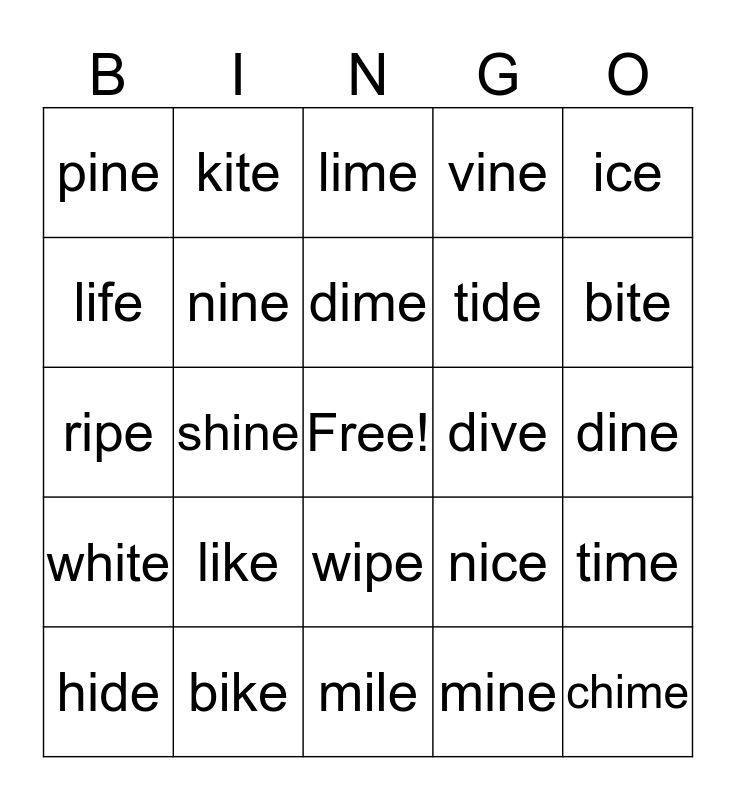 This bingo card has a free space and 24 words: like, bike, dime, hide, ice, pine, life, kite, dive, wipe, tide, ripe, nice, time, nine, mine, dine, lime, bite, shine, chime, white, vine and mile.