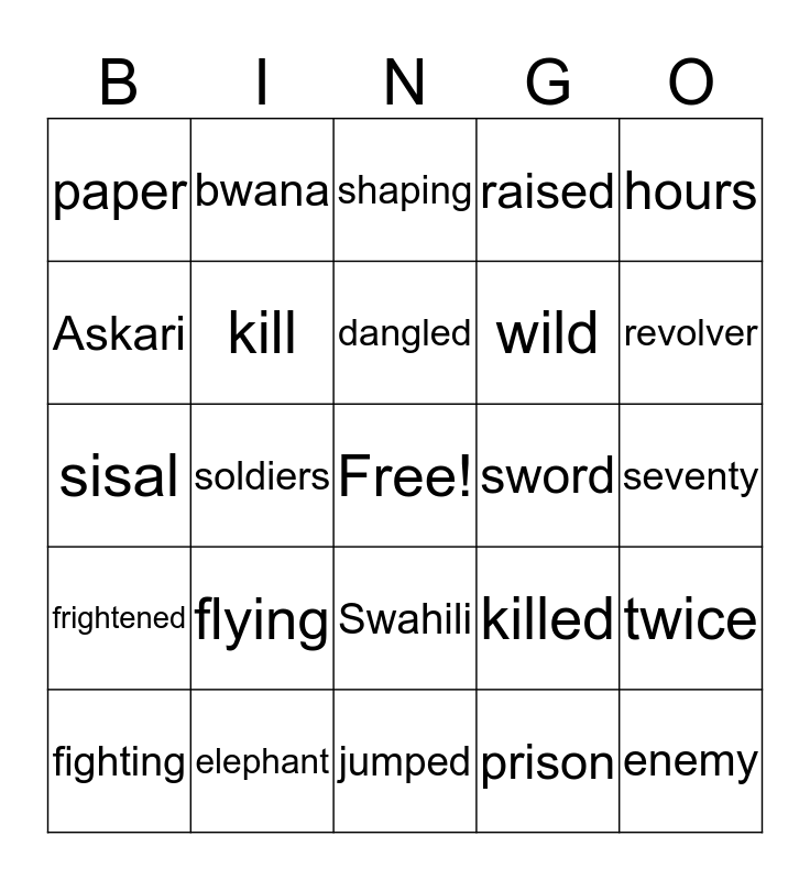 This bingo card has a free space and 24 words: flying, elephant, dangled, fighting, hours, paper, Askari, bwana, sword, Swahili, wild, sisal, killed, twice, kill, prison, seventy, shaping, revolver, soldiers, enemy, frightened, raised and jumped.