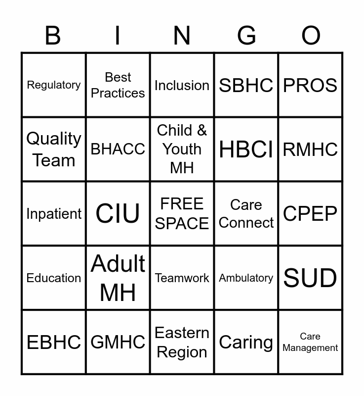 This bingo card has a free space and 38 words: UMMC, TMS Clinic, Unity, BHACC, SUD, Adult MH, Child & Youth MH, ACT, PROS, HBCI, CIU, SBHC, Care Management, CPEP, Quality Team, Education, Policy & Procedure, Inclusion, Super-Users, Care Connect, Regulatory, GMHC, RMHC, EBHC, RGH, Eastern Region, HIM, OMH, OASAS, Trauma-Informed Care, Leadership, Teamwork, Caring, Best Practices, Recovery, Ambulatory, Inpatient and Telehealth.