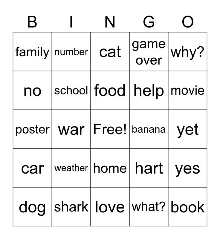 This bingo card has a free space and 24 words: weather, shark, food, dog, why?, family, no, number, banana, home, help, poster, hart, yes, school, what?, yet, cat, movie, war, book, car, game over and love.