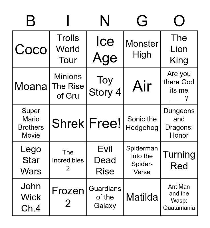 This bingo card has a free space and 24 words: The Incredibles 2, Frozen 2, Toy Story 4, John Wick Ch.4, The Lion King, Coco, Moana, Trolls World Tour, Sonic the Hedgehog, Evil Dead Rise, Air, Super Mario Brothers Movie, Spiderman into the Spider-Verse, Turning Red, Minions The Rise of Gru, Matilda, Dungeons and Dragons: Honor, Ice Age, Are you there God its me ____?, Shrek, Ant Man and the Wasp: Quatamania, Lego Star Wars, Monster High and Guardians of the Galaxy.