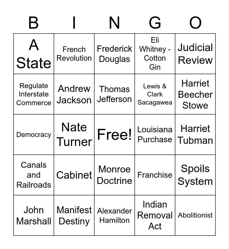 This bingo card has a free space and 25 words: Cabinet, Alexander Hamilton, Thomas Jefferson, John Marshall, Judicial Review, A State, Regulate Interstate Commerce, French Revolution, Louisiana Purchase, Monroe Doctrine, Lewis & Clark Sacagawea, Democracy, Franchise, Spoils System, Andrew Jackson, Elizabeth Cady Stanton, Harriet Tubman, Frederick Douglas, Harriet Beecher Stowe, Nate Turner, Abolitionist, Manifest Destiny, Canals and Railroads, Eli Whitney - Cotton Gin and Indian Removal Act.