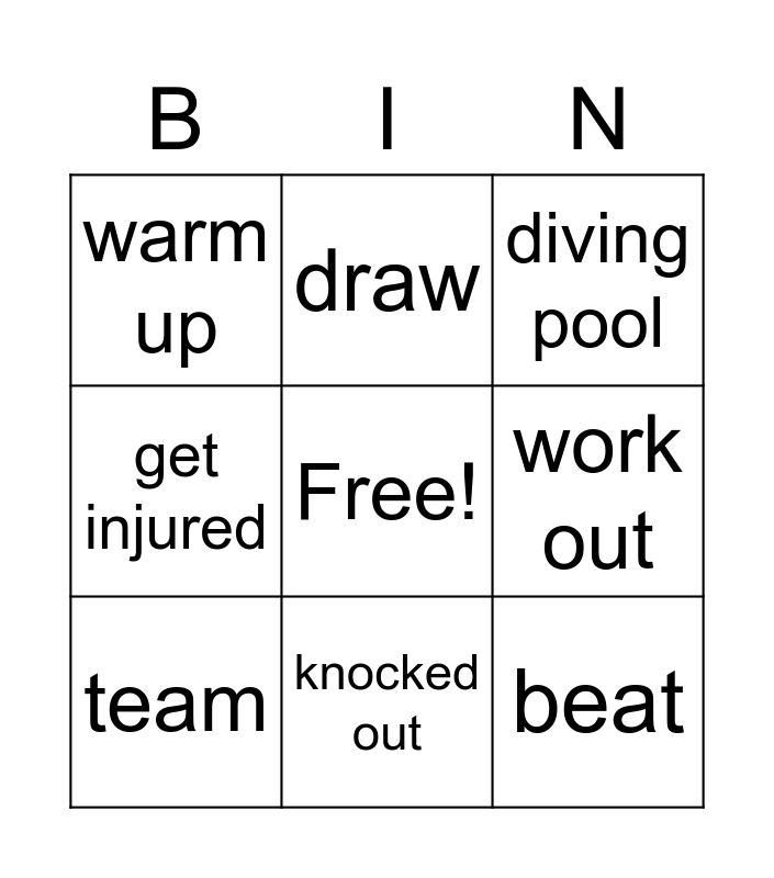 This bingo card has a free space and 8 words: work out, diving pool, draw, team, warm up, beat, get injured and knocked out.