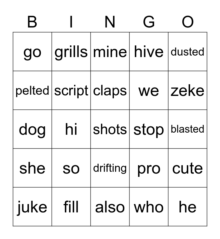 This bingo card has 68 words: scripts, shots, welts, begs, flags, jugs, grills, rams, claps, standing, drifting, hinting, blasted, dusted, listed, pelted, hi, go, me, so, we, pro, she, he, hike, ape, joke, flute, cute, pete, mine, vote, eve, fine, hive, mule, mute, juke, zeke, dog, hat, mat, script, pack, just, lash, rim, whip, stop, fill, grass, why, of, also, been, into, who, want, because, come, should, our, were, where, what, said, have and very.