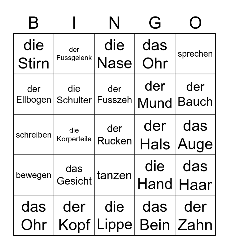 This bingo card has a free space and 29 words: das Ohr, der Korper, die Korperteile, das Kinn, die Stirn, die Nase, die Schulter, das Gesicht, der Hals, der Kopf, das Auge, der Zahn, die Lippe, das Bein, der Bauch, joggen, tanzen, bewegen, sprechen, schreiben, die Hand, das Knie, der Mund, der Ellbogen, das Ohr, der Fussgelenk, das Haar, der Fusszeh and Fitness tun.