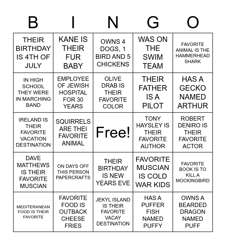 This bingo card has a free space and 24 words: ON DAYS OFF THIS PERSON PAPERCRAFTS, FAVORITE FOOD IS OUTBACK CHEESE FRIES, OLIVE DRAB IS THEIR FAVORITE COLOR, MEDITERANEAN FOOD IS THEIR FAVORITE, FAVORITE ANIMAL IS THE HAMMERHEAD SHARK, THEIR BIRTHDAY IS 4TH OF JULY, IN HIGH SCHOOL THEY WERE IN MARCHING BAND, KANE IS THEIR FUR BABY, TONY HAYSLEY IS THEIR FAVORITE AUTHOR, THEIR BIRTHDAY IS NEW YEARS EVE, THEIR FATHER IS A PILOT, IRELAND IS THEIR FAVORITE VACATION DESTINATION, FAVORITE MUSCIAN IS COLD WAR KIDS, FAVORITE BOOK IS TO KILL A MOCKINGBIRD, EMPLOYEE OF JEWISH HOSPITAL FOR 30 YEARS, HAS A PUFFER FISH NAMED PUFFY, ROBERT DENIRO IS THEIR FAVORITE ACTOR, OWNS 4 DOGS, 1 BIRD AND 5 CHICKENS, HAS A GECKO NAMED ARTHUR, SQUIRRELS ARE THEI FAVORITE ANIMAL, OWNS A BEARDED DRAGON NAMED PUFF, DAVE MATTHEWS IS THEIR FAVORITE MUSCIAN, WAS ON THE SWIM TEAM and JEKYL ISLAND IS THEIR FAVORITE VACAY DESTINATION.