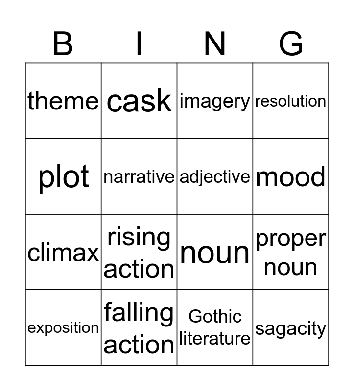 This bingo card has a free space and 15 words: exposition, sagacity, imagery, theme, mood, plot, rising action, Gothic literature, narrative, climax, proper noun, resolution, adjective, cask and falling action.