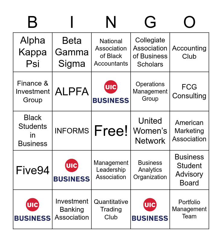 This bingo card has 4 images, a free space and 20 words: Accounting Club, Alpha Kappa Psi, Beta Gamma Sigma, National Association of Black Accountants, United Women’s Network, American Marketing Association, Black Students in Business, ALPFA, Business Analytics Organization, Business Student Advisory Board, Finance & Investment Group, Investment Banking Association, Quantitative Trading Club, Collegiate Association of Business Scholars, FCG Consulting, Five94, INFORMS, Management Leadership Association, Operations Management Group and Portfolio Management Team.