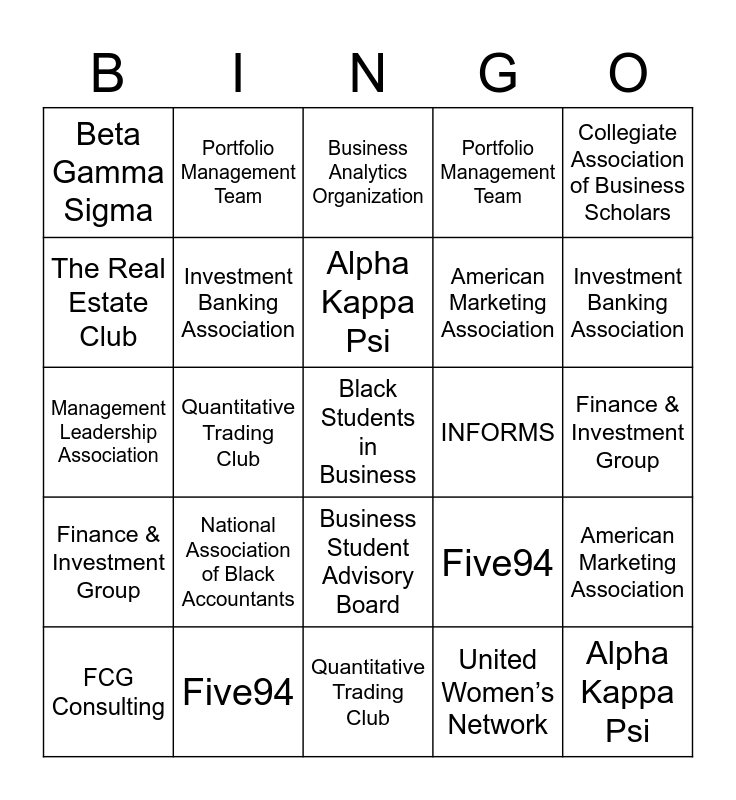 This bingo card has 42 words: Accounting Club, Alpha Kappa Psi, Beta Gamma Sigma, National Association of Black Accountants, United Women’s Network, American Marketing Association, Black Students in Business, ALPFA, Business Analytics Organization, Business Student Advisory Board, Finance & Investment Group, Investment Banking Association, Quantitative Trading Club, Collegiate Association of Business Scholars, FCG Consulting, Five94, INFORMS, Management Leadership Association, Operations Management Group, Portfolio Management Team, The Real Estate Club, Accounting Club, Alpha Kappa Psi, Beta Gamma Sigma, National Association of Black Accountants, United Women’s Network, American Marketing Association, Black Students in Business, ALPFA, Business Analytics Organization, Business Student Advisory Board, Finance & Investment Group, Investment Banking Association, Quantitative Trading Club, Collegiate Association of Business Scholars, FCG Consulting, Five94, INFORMS, Management Leadership Association, Operations Management Group, Portfolio Management Team and The Real Estate Club.