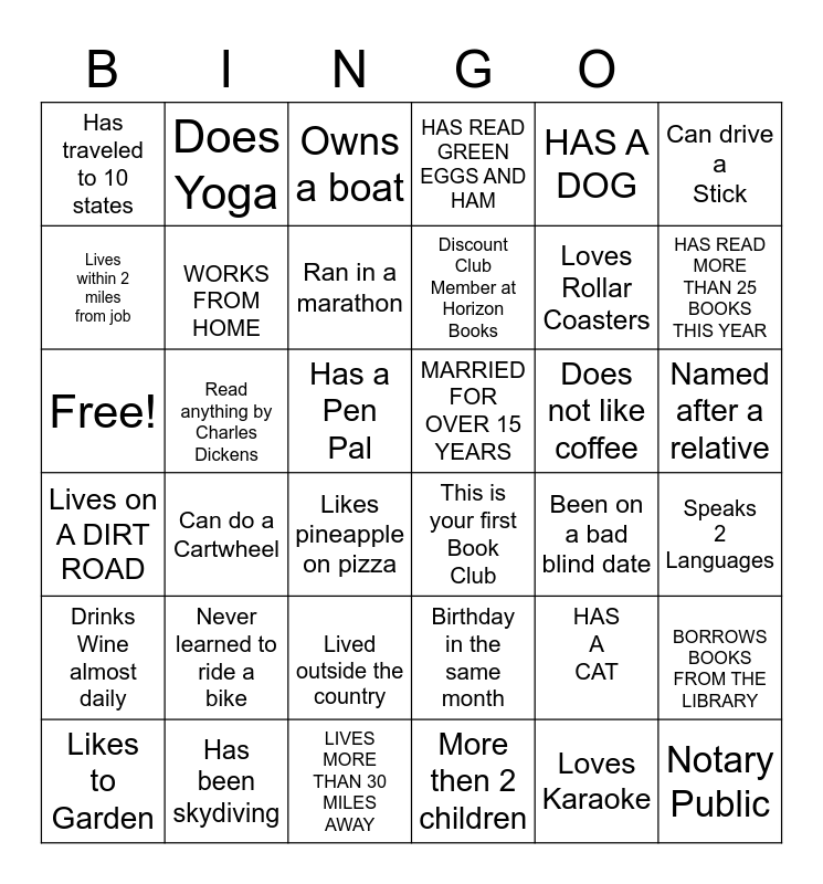 This bingo card has 36 words: Birthday in the same month, Lived outside the country, More then 2 children, Lives within 2 miles from job, Lives on A DIRT ROAD, MARRIED FOR OVER 15 YEARS, WORKS FROM HOME, LIVES MORE THAN 30 MILES AWAY, HAS A DOG, HAS A CAT, HAS READ MORE THAN 25 BOOKS THIS YEAR, HAS READ GREEN EGGS AND HAM, BORROWS BOOKS FROM THE LIBRARY, Read anything by Charles Dickens, Discount Club Member at Horizon Books, Has traveled to 10 states, Drinks Wine almost daily, Does not like coffee, Free!, Owns a boat, Has a Pen Pal, Can do a Cartwheel, This is your first Book Club, Likes pineapple on pizza, Been on a bad blind date, Does Yoga, Loves Rollar Coasters, Has been skydiving, Ran in a marathon, Can drive a Stick, Notary Public, Likes to Garden, Speaks 2 Languages, Named after a relative, Never learned to ride a bike and Loves Karaoke.