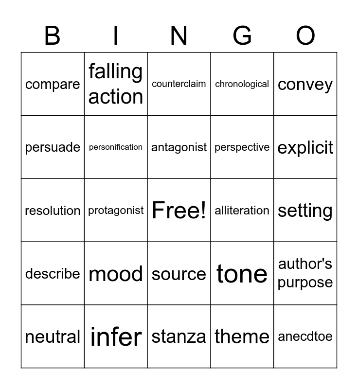 This bingo card has a free space and 24 words: mood, infer, antagonist, neutral, convey, compare, persuade, falling action, alliteration, source, perspective, resolution, tone, author's purpose, personification, theme, setting, counterclaim, explicit, protagonist, anecdtoe, describe, chronological and stanza.