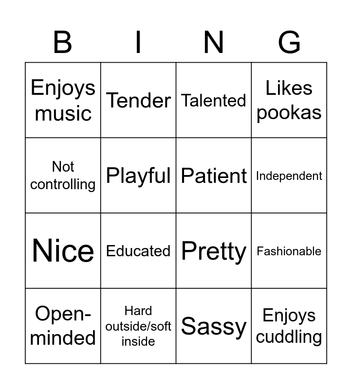 This bingo card has 16 words: Hard outside/soft inside, Fashionable, Talented, Enjoys music, Nice, Tender, Pretty, Sassy, Not controlling, Playful, Open-minded, Likes pookas, Educated, Independent, Patient and Enjoys cuddling.