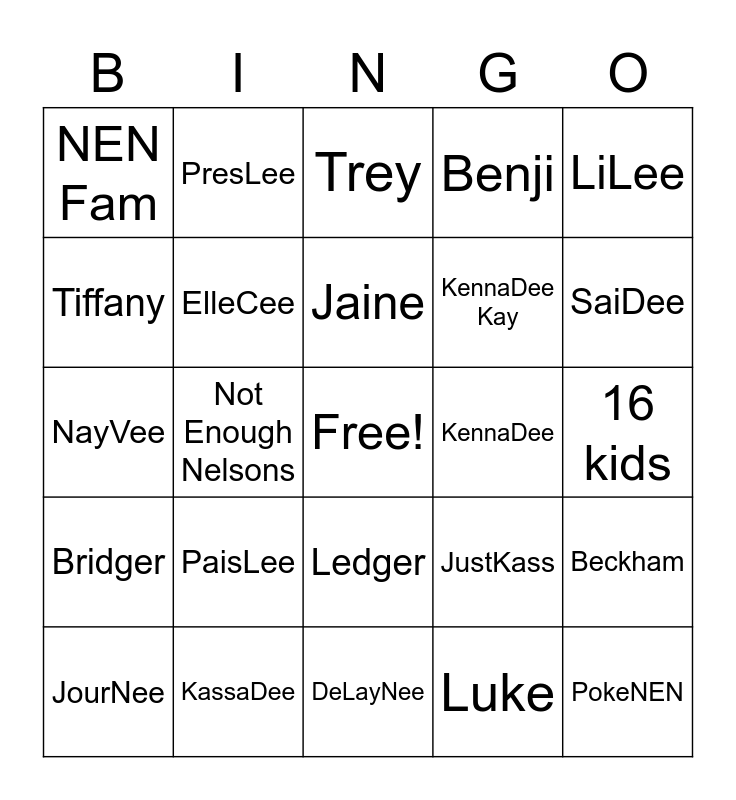 This bingo card has a free space and 24 words: PaisLee, KassaDee, Jaine, JourNee, LiLee, NEN Fam, Tiffany, PresLee, KennaDee, Ledger, KennaDee Kay, NayVee, JustKass, Beckham, ElleCee, Luke, 16 kids, Trey, SaiDee, Not Enough Nelsons, PokeNEN, Bridger, Benji and DeLayNee.