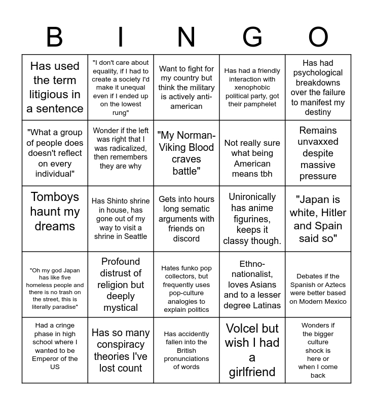 This bingo card has a free space and 24 words: Profound distrust of religion but deeply mystical, Has so many conspiracy theories I've lost count, "My Norman-Viking Blood craves battle", Had a cringe phase in high school where I wanted to be Emperor of the US, Has had psychological breakdowns over the failure to manifest my destiny, Has used the term litigious in a sentence, "What a group of people does doesn't reflect on every individual", "I don't care about equality, if I had to create a society I'd make it unequal even if I ended up on the lowest rung", Unironically has anime figurines, keeps it classy though., Hates funko pop collectors, but frequently uses pop-culture analogies to explain politics, Not really sure what being American means tbh, Tomboys haunt my dreams, Ethno-nationalist, loves Asians and to a lesser degree Latinas, Debates if the Spanish or Aztecs were better based on Modern Mexico, Wonder if the left was right that I was radicalized, then remembers they are why, Volcel but wish I had a girlfriend, "Japan is white, Hitler and Spain said so", Want to fight for my country but think the military is actively anti-american, Remains unvaxxed despite massive pressure, Has Shinto shrine in house, has gone out of my way to visit a shrine in Seattle, Wonders if the bigger culture shock is here or when I come back, "Oh my god Japan has like five homeless people and there is no trash on the street, this is literally paradise", Has had a friendly interaction with xenophobic political party, got their pamphelet and Has accidently fallen into the British pronunciations of words.