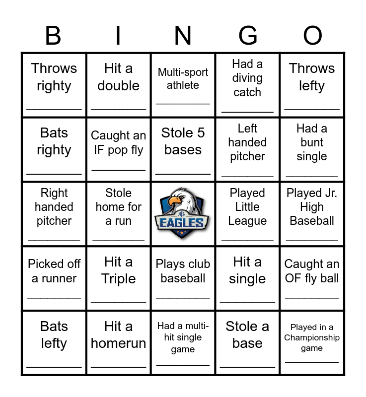 This bingo card has a free space and 24 words: Hit a Triple _______, Hit a homerun _______, Stole 5 bases _______, Bats lefty _______, Throws lefty _______, Throws righty _______, Bats righty _______, Hit a double _______, Played Little League ________, Plays club baseball ________, Left handed pitcher ________, Right handed pitcher ________, Hit a single _______, Caught an OF fly ball ________, Caught an IF pop fly ________, Stole a base _______, Played Jr. High Baseball ________, Multi-sport athlete _________, Had a bunt single ________, Stole home for a run ________, Played in a Championship game ___________, Picked off a runner ________, Had a diving catch ________ and Had a multi-hit single game __________.