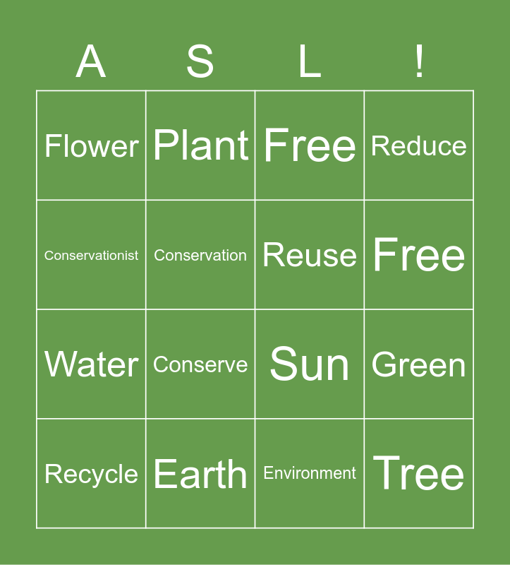 This bingo card has 16 words: Earth, Green, Free, Flower, Water, Plant, Sun, Environment, Conservationist, Conservation, Recycle, Reduce, Conserve, Free, Reuse and Tree.