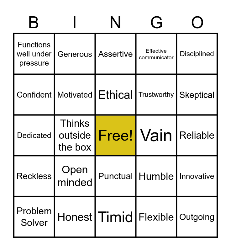 This bingo card has a free space and 24 words: Open minded, Honest, Ethical, Problem Solver, Disciplined, Functions well under pressure, Confident, Generous, Vain, Punctual, Trustworthy, Dedicated, Humble, Innovative, Motivated, Flexible, Reliable, Assertive, Skeptical, Thinks outside the box, Outgoing, Reckless, Effective communicator and Timid.