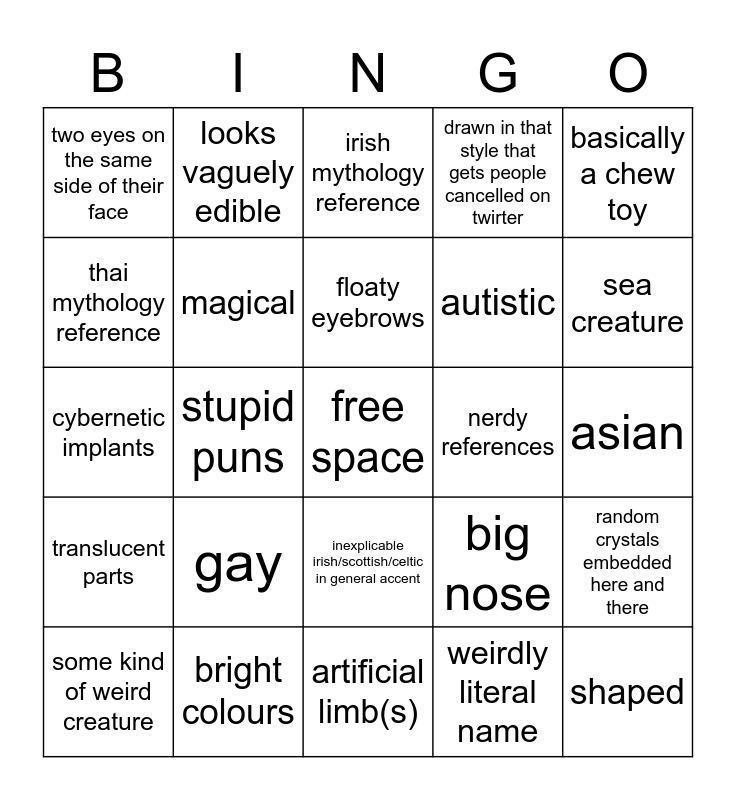 This bingo card has a free space and 24 words: gay, bright colours, floaty eyebrows, some kind of weird creature, basically a chew toy, two eyes on the same side of their face, thai mythology reference, looks vaguely edible, nerdy references, inexplicable irish/scottish/celtic in general accent, autistic, cybernetic implants, big nose, random crystals embedded here and there, magical, weirdly literal name, asian, irish mythology reference, sea creature, stupid puns, shaped, translucent parts, drawn in that style that gets people cancelled on twirter and artificial limb(s).