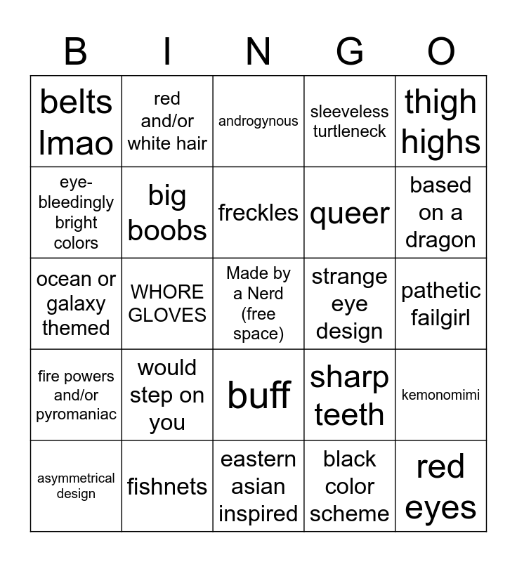 This bingo card has a free space and 24 words: asymmetrical design, would step on you, freckles, black color scheme, thigh highs, belts lmao, red and/or white hair, androgynous, strange eye design, pathetic failgirl, ocean or galaxy themed, big boobs, sharp teeth, kemonomimi, eye-bleedingly bright colors, fishnets, eastern asian inspired, sleeveless turtleneck, based on a dragon, fire powers and/or pyromaniac, WHORE GLOVES, buff, queer and red eyes.