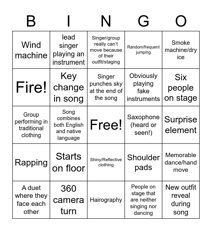 This bingo card has a free space and 24 words: Starts on floor, 360 camera turn, Singer punches sky at the end of the song, A duet where they face each other, Smoke machine/dry ice, Wind machine, Fire!, lead singer playing an instrument, Saxophone (heard or seen!), Shiny/Reflective clothing, Obviously playing fake instruments, Group performing in traditional clothing, Shoulder pads, Memorable dance/hand move, Key change in song, People on stage that are neither singing nor dancing, Surprise element, Singer/group really can’t move because of their outfit/staging, Six people on stage, Song combines both English and native language, New outfit reveal during song, Rapping, Random/frequent jumping and Hairography.