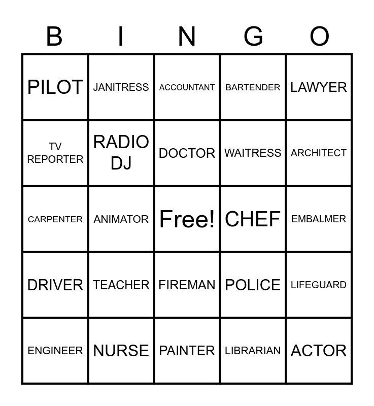 This bingo card has a free space and 24 words: TEACHER, NURSE, DOCTOR, ENGINEER, LAWYER, PILOT, TV REPORTER, JANITRESS, CHEF, FIREMAN, WAITRESS, CARPENTER, POLICE, LIFEGUARD, RADIO DJ, LIBRARIAN, EMBALMER, ACCOUNTANT, ARCHITECT, ANIMATOR, ACTOR, DRIVER, BARTENDER and PAINTER.