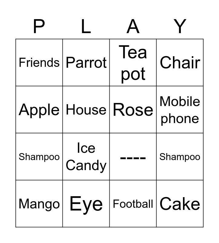 This bingo card has 40 words: Tree, ----, Dog, Rose, Lotus, Laptop, Mobile phone, Pillow, Apple, Cake, Shampoo, Chair, Mango, Football, Eye, Water, Basketball, Friends, Keychain, Tea pot, Galaxy, Light bulb, Shampoo, House, Mushroom, Umbrella, Car, Hanger, Pencil, Watermelon, Butterfly, Brownie, Fish, Burger, Ice Candy, Rainbow, Honeybee, Peacock, Parrot and Cycle.