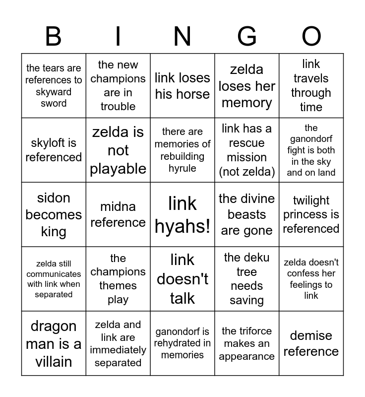 This bingo card has a free space and 24 words: the champions themes play, zelda and link are immediately separated, there are memories of rebuilding hyrule, dragon man is a villain, link travels through time, the tears are references to skyward sword, skyloft is referenced, the new champions are in trouble, the divine beasts are gone, link doesn't talk, link has a rescue mission (not zelda), sidon becomes king, the deku tree needs saving, zelda doesn't confess her feelings to link, zelda is not playable, the triforce makes an appearance, twilight princess is referenced, link loses his horse, the ganondorf fight is both in the sky and on land, midna reference, demise reference, zelda still communicates with link when separated, zelda loses her memory and ganondorf is rehydrated in memories.