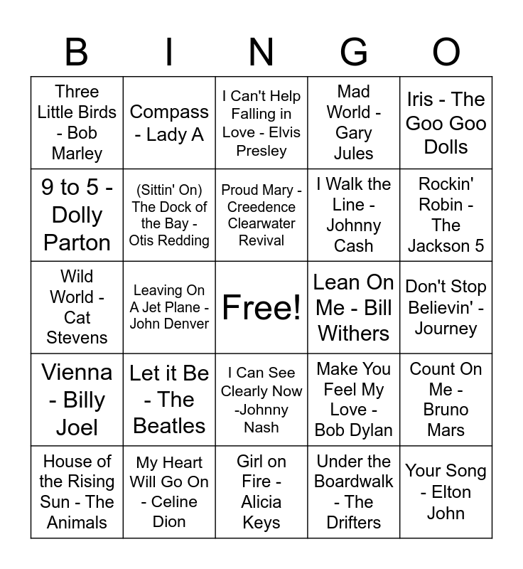 This bingo card has a free space and 24 words: Let it Be - The Beatles, My Heart Will Go On - Celine Dion, Proud Mary - Creedence Clearwater Revival, House of the Rising Sun - The Animals, Iris - The Goo Goo Dolls, Three Little Birds - Bob Marley, 9 to 5 - Dolly Parton, Compass - Lady A, Lean On Me - Bill Withers, I Can See Clearly Now -Johnny Nash, I Walk the Line - Johnny Cash, Wild World - Cat Stevens, Make You Feel My Love - Bob Dylan, Count On Me - Bruno Mars, (Sittin' On) The Dock of the Bay - Otis Redding, Under the Boardwalk - The Drifters, Don't Stop Believin' - Journey, I Can't Help Falling in Love - Elvis Presley, Rockin' Robin - The Jackson 5, Leaving On A Jet Plane - John Denver, Your Song - Elton John, Vienna - Billy Joel, Mad World - Gary Jules and Girl on Fire - Alicia Keys.