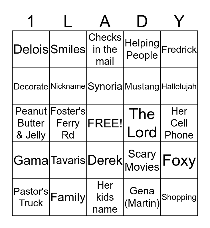 This bingo card has a free space and 24 words: Tavaris, Family, Synoria, Pastor's Truck, Fredrick, Delois, Decorate, Smiles, The Lord, Derek, Mustang, Peanut Butter & Jelly, Scary Movies, Foxy, Nickname, Gena (Martin), Her Cell Phone, Checks in the mail, Hallelujah, Foster's Ferry Rd, Shopping, Gama, Helping People and Her kids name.