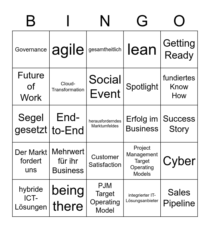 This bingo card has 89 words: Free!, Ablauforganisation, agile, ambitionierte Zielsetzung, anspruchsvolles Marktumfeld, aus einer Hand, Awareness, being there, Bereit, bereiter werden, Bestes Kundenerlebnis, Cloud Trends, Cloud-Transformation, Customer Satisfaction, Customer Service, Cyber, Der Markt fordert uns, digital first, digital journey, Digital Mindset, E-Ticket, ein durchgehendes Erlebnis, End-to-End, Entdeckungsreise, Erfolg im Business, Facts, Fokus, fokussieren, fokussieren, fokussierter, fundiertes Know How, Future of Work, gebündelt, gesamtheitlich, Get it done, Getting Ready, Governance, Handover, herausforderndes Marktumfeldes, Highlights, Homebase, hybride ICT-Lösungen, höchste Flexibilität, integrierte Business Units, integrierter IT-Lösungsanbieter, Kompetenzen bündeln, kontinuierlich weiterentwickeln, Konvergente Vernetzungsangebote, Kurs, lean, Learnings, Leuchtturm, Level Up, Management Team, managen, Market Research, Marktchancen, Mehrwert für ihr Business, Mindset, Must Win Battle, Networking Priorities, New Joiners, NPS, Nummer 1, Operational Excellence, operative Erfahrung, Performance-Stellhebel, Performing Together, PJM Target Operating Model, Project Management Target Operating Models, Sales Pipeline, Segel gesetzt, segmentübergreifend, Social Event, Spotlight, standardisierte "as a Service" Modelle, starke Strategie, Starkes Wachstum, Stärken bündeln, Stärken optimal nutzen, Success Story, top Marktleistung, transversalen Rollen, unter einem Dach, Verrechenbarkeit, zugeschnittene Lösungen, Zusammenspiel, Meilenstein and Business Value schaffen.