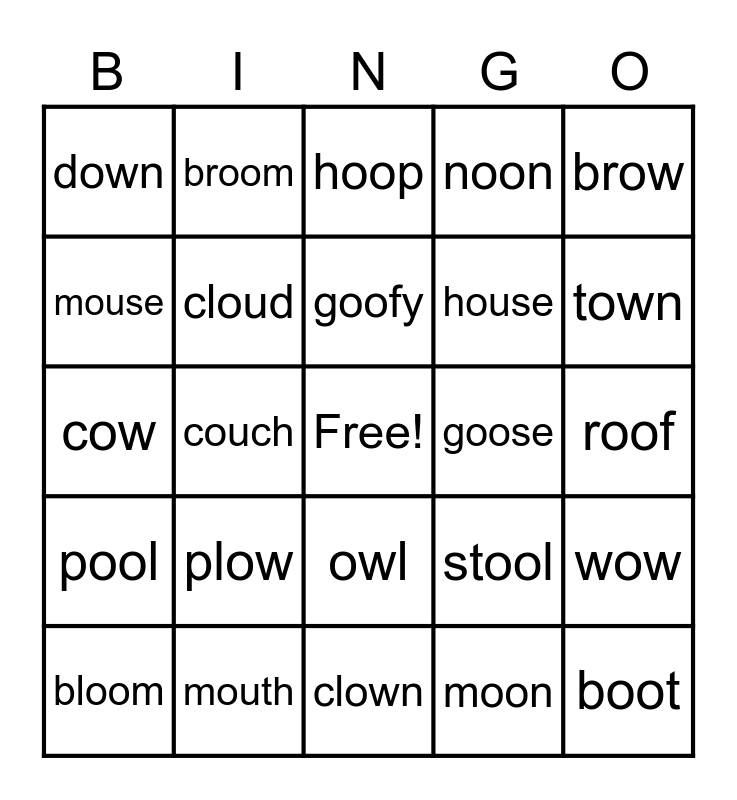 This bingo card has a free space and 24 words: plow, mouth, goofy, bloom, brow, down, mouse, broom, goose, owl, house, cow, stool, wow, cloud, moon, roof, hoop, town, couch, boot, pool, noon and clown.