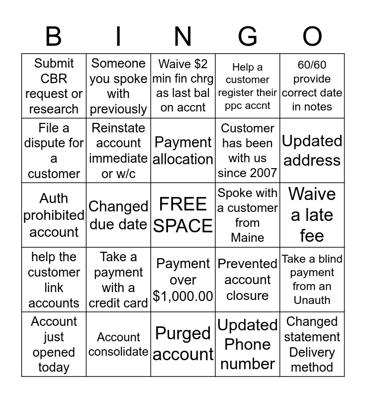 This bingo card has a free space and 24 words: Take a payment with a credit card, Account consolidate, Payment allocation, Account just opened today, 60/60 provide correct date in notes, Submit CBR request or research, File a dispute for a customer, Someone you spoke with previously, Spoke with a customer from Maine, Payment over $1,000.00, Customer has been with us since 2007, Auth prohibited account, Prevented account closure, Take a blind payment from an Unauth, Reinstate account immediate or w/c, Updated Phone number, Waive a late fee, Waive $2 min fin chrg as last bal on accnt, Updated address, Changed due date, Changed statement Delivery method, help the customer link accounts, Help a customer register their ppc accnt and Purged account.