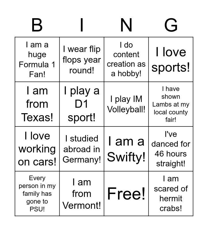 This bingo card has 17 words: Free!, Every person in my family has gone to PSU!, I do content creation as a hobby!, I am a huge Formula 1 Fan!, I studied abroad in Germany!, I love sports!, I've danced for 46 hours straight!, I play IM Volleyball!, I have shown Lambs at my local county fair!, I play a D1 sport!, I am from Vermont!, I am a Swifty!, I am from Texas!, I wear flip flops year round!, I love working on cars!, I love to cook! and I am scared of hermit crabs!.