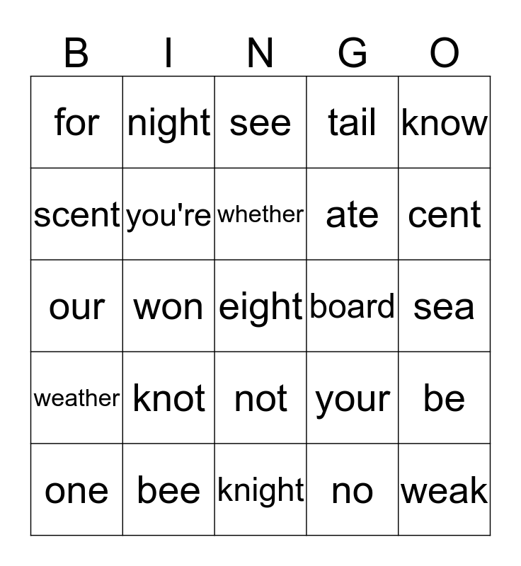 This bingo card has 36 words: two, to, too, you're, your, weather, whether, bored, know, week, won, tail, tale, board, cent, for, weak, knot, eight, see, sea, be, bee, one, knight, night, our, hour, ate, scent, sent, four, no, not, dear and deer.