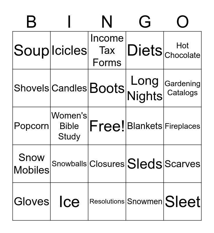 This bingo card has a free space and 24 words: Snowballs, Ice, Boots, Gloves, Hot Chocolate, Soup, Shovels, Icicles, Blankets, Closures, Long Nights, Popcorn, Sleds, Scarves, Candles, Snowmen, Fireplaces, Income Tax Forms, Gardening Catalogs, Women's Bible Study, Sleet, Snow Mobiles, Diets and Resolutions.