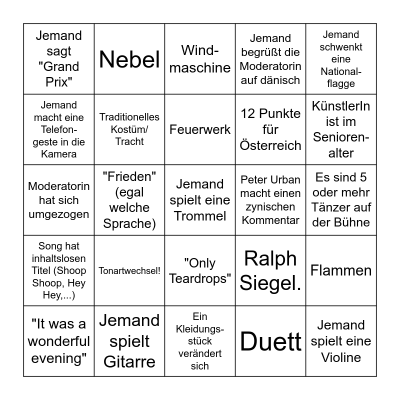This bingo card has 29 words: "It was a wonderful evening", "Thank you for a fantastic show", "Frieden" (egal welche Sprache), Jemand spielt eine Violine, Jemand sagt "Grand Prix", Wind-maschine, Traditionelles Kostüm/ Tracht, Tonartwechsel!, Peter Urban macht einen zynischen Kommentar, Jemand spielt Gitarre, Es sind 5 oder mehr Tänzer auf der Bühne, Jemand spielt eine Trommel, Ein Kleidungs-stück verändert sich, Duett, KünstlerIn ist im Senioren-alter, Künstler singt in der Landes-sprache, "Only Teardrops", Song hat inhaltslosen Titel (Shoop Shoop, Hey Hey,...), Jemand schwenkt eine National-flagge, Moderatorin hat sich umgezogen, Ralph Siegel., 12 Punkte für Deutsch-land, 12 Punkte für Österreich, Jemand macht eine Telefon-geste in die Kamera, Jemand begrüßt die Moderatorin auf dänisch, Nebel, Flammen, Feuerwerk and Konfetti.