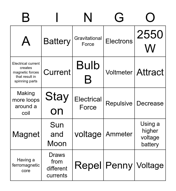 This bingo card has 26 words: voltage, Penny, Bulb B, Draws from different currents, 2550 W, A, Electrical current creates magnetic forces that result in spinning parts, Battery, Decrease, Ammeter, Voltmeter, Making more loops around a coil, Using a higher voltage battery, Having a ferromagnetic core, Stay on, Protons, Electrons, Magnet, Gravitational Force, Electrical Force, Attract, Repel, Repulsive, Sun and Moon, Current and Voltage.