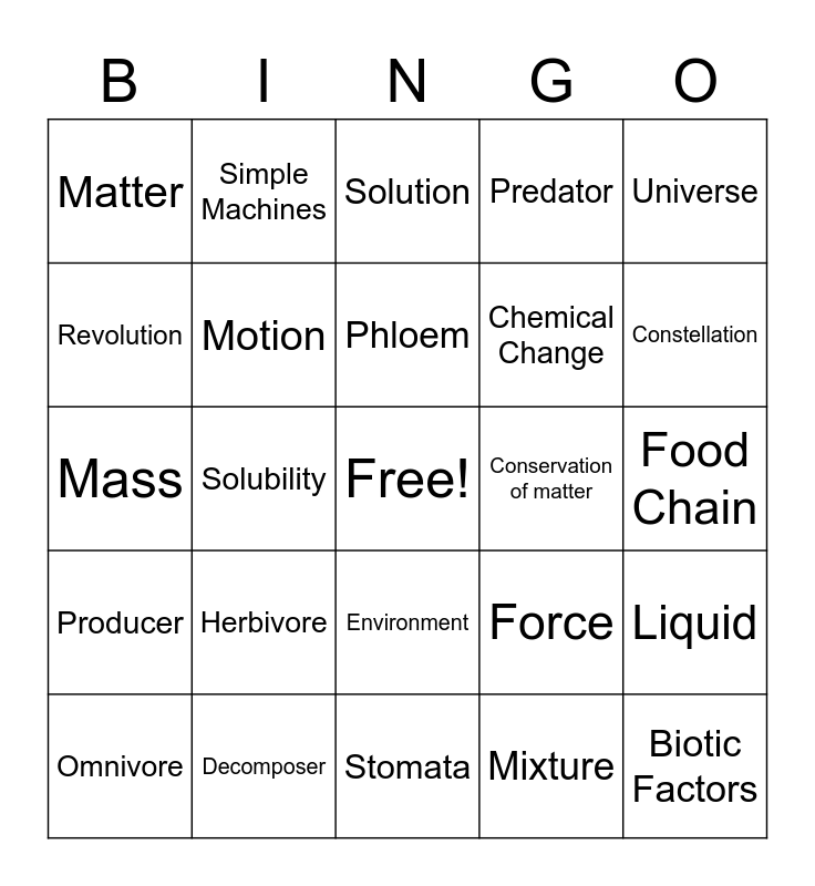 This bingo card has a free space and 24 words: Herbivore, Decomposer, Phloem, Omnivore, Universe, Matter, Revolution, Simple Machines, Conservation of matter, Environment, Chemical Change, Mass, Force, Liquid, Motion, Mixture, Food Chain, Solution, Constellation, Solubility, Biotic Factors, Producer, Predator and Stomata.