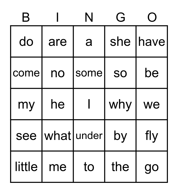 This bingo card has 25 words: what, to, some, little, have, do, come, are, why, under, so, my, by, fly, no, go, we, a, be, he, I, me, see, she and the.