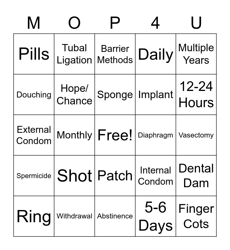 This bingo card has a free space and 28 words: Dental Dam, Weekly, Implant, 5-6 Days, Douching, Barrier Methods, Tubal Ligation, Spermicide, Diaphragm, Ring, External Condom, Daily, Withdrawal, Abstinence, 12-24 Hours, IUD, Shot, Hope/ Chance, Sponge, Patch, Pills, Hormonal Methods, Finger Cots, Monthly, Vasectomy, Internal Condom, Multiple Years and Emergency Contraception.