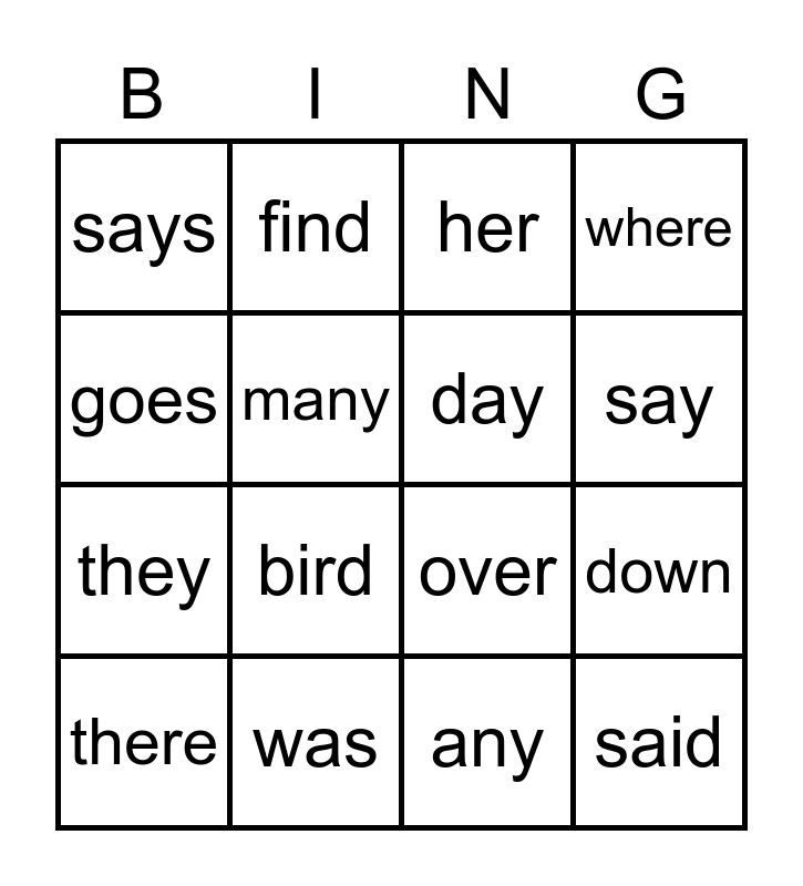 This bingo card has 16 words: was, down, her, says, they, find, over, any, goes, many, there, where, bird, say, day and said.